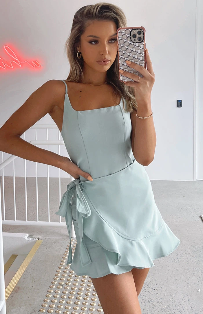 Feel girly and feminine in our Better Now Mini Dress in Sage. This mini dress has thin adjustable straps, invisible zipper centre back, frilled hemline, square neckline, wrap skirt style and is lined to avoid sheerness. Complete the look with heels and a on trend mini shoulder bag for a chic day or night outfit. You can never shop too early for homecoming, this is the perfect choice for an effortlessly glam finish.