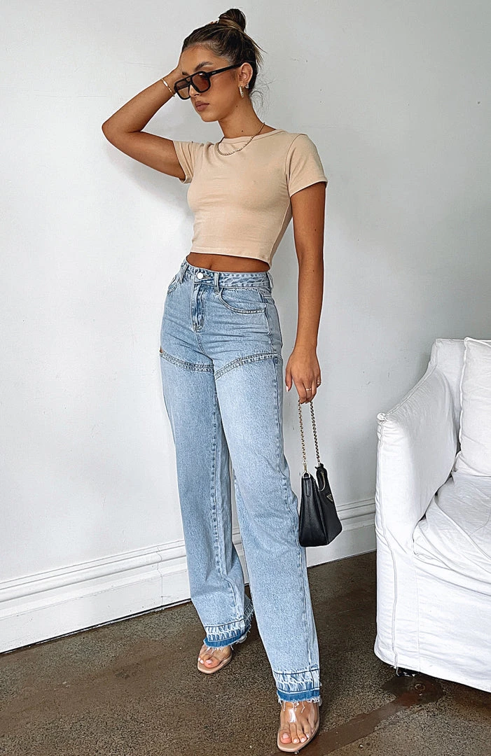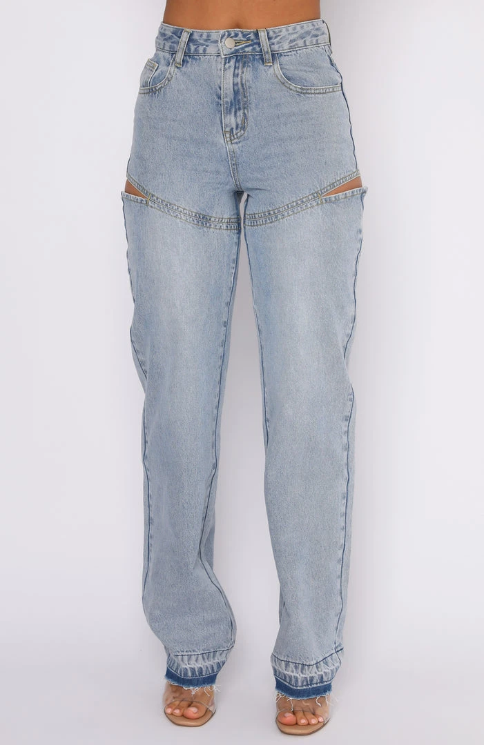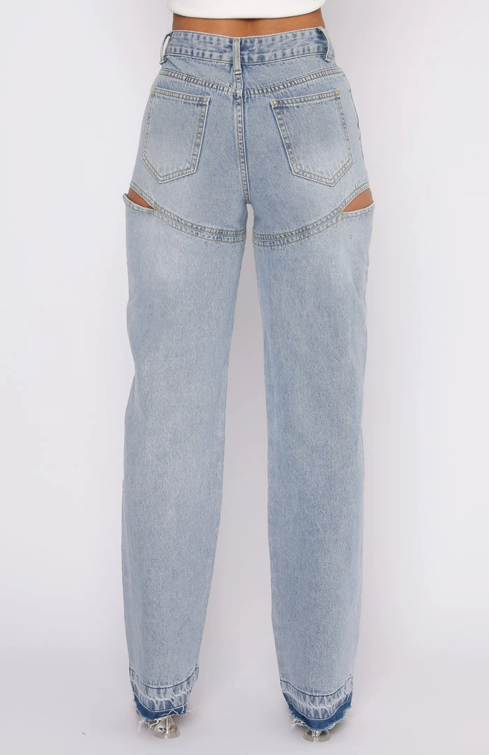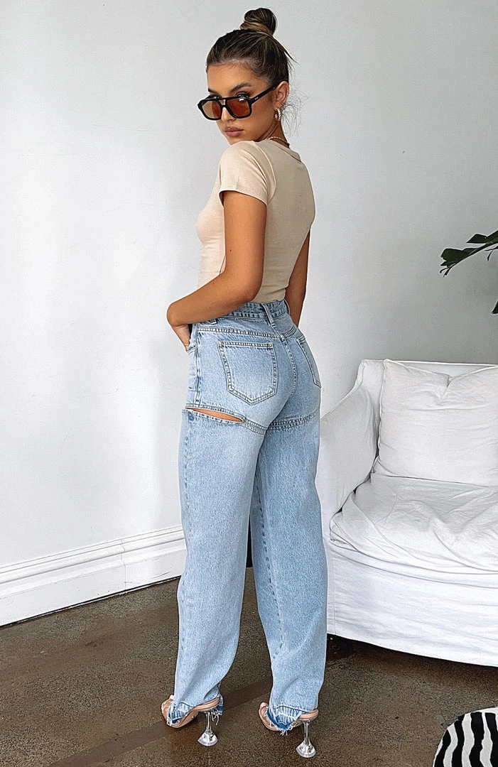 Add a sexy twist to your classic denim in the Born To Run Jeans in Blue Denim. These relaxed fit jeans are a straight leg style with a distressed dye hem and are high waisted with silver button closure & zip at front, belt loops, 5 pocket design, cut out side design and are full length. Team with one of our basic crops and fresh kicks.