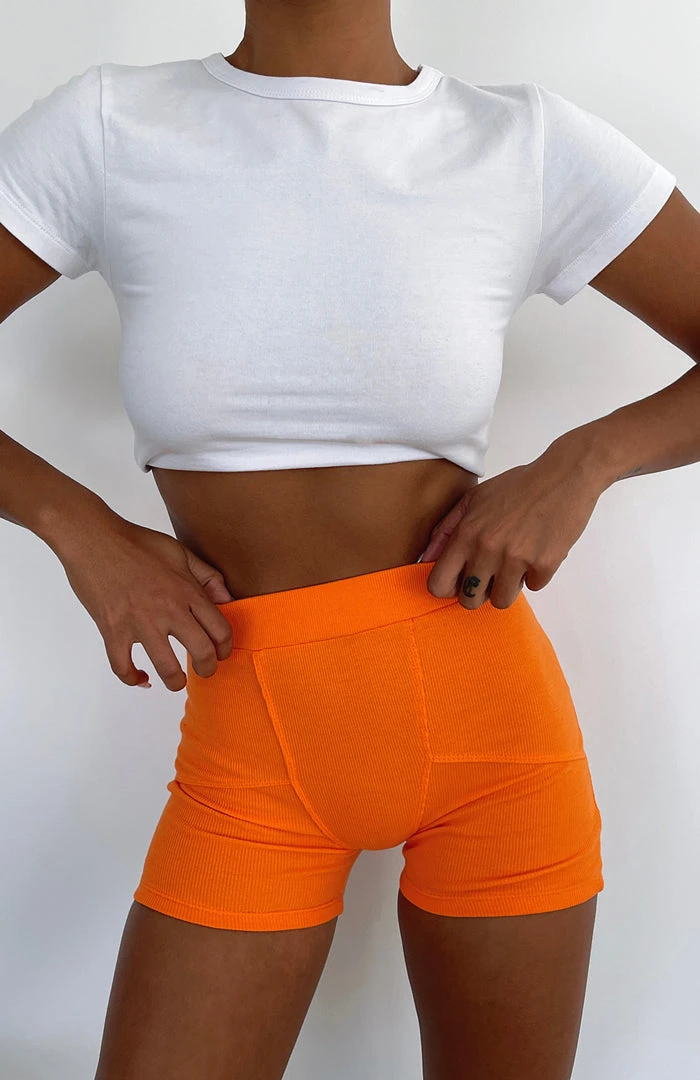 Your off-duty look is not complete without the Reality Check Ribbed Bike Shorts in Orange. These bike shorts are high waisted with a elasticated waistband and ribbed, stretch fabric. Pair with a cute baby tee and sneakers for the perfect lounge vibe.
