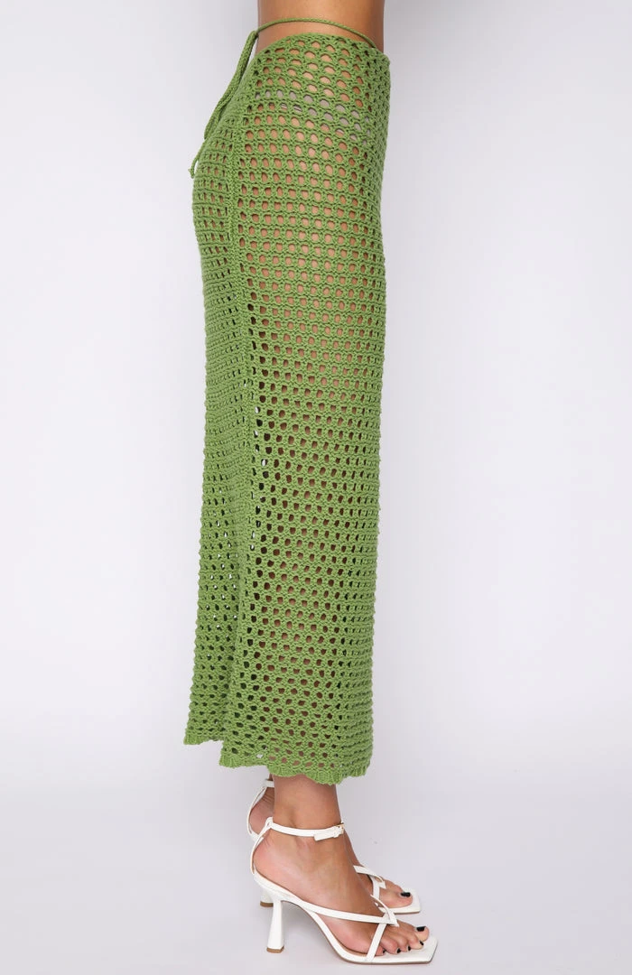 The Thinking About You Midi Skirt in Green is the ultimate summer staple. This midi skirt is high waisted with tie waist design and unlined crochet fabric. Style with the matching Past Life Crop and slides for the perfect outfit for those warmer days.