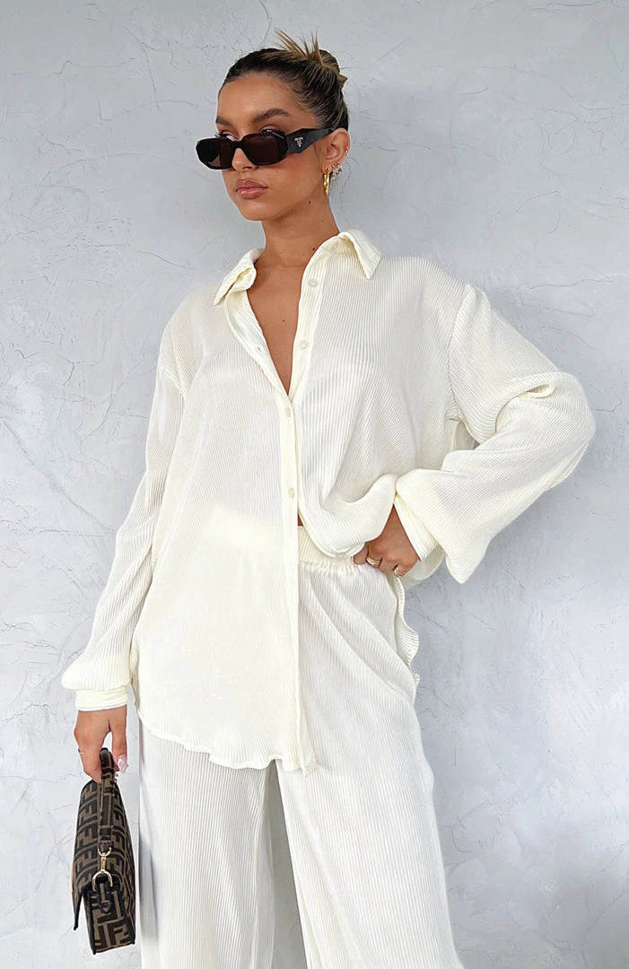 The Destined For You Long Sleeve Shirt in Cream is so stylish, we are obsessed! This long sleeve shirt features an open collar, long billowy sleeves, button up closure and plisse finish. It’s relaxed enough to wear too casual hangs but luxe enough to style up for work or dressier occasions. Wear with the matching Sincerely Yours Pants.