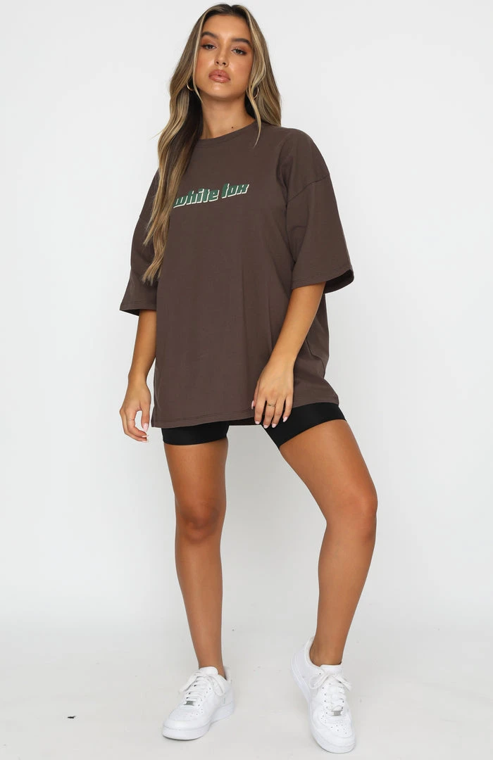 Get the ultimate loungewear look in our Don’t Think Twice Tee in Chocolate. This top is an oversized fit with a high scooped neckline, slouch shoulders, and printed logo centre front. Complete the look with bike shorts or denim shorts for an effortless but stylish look.