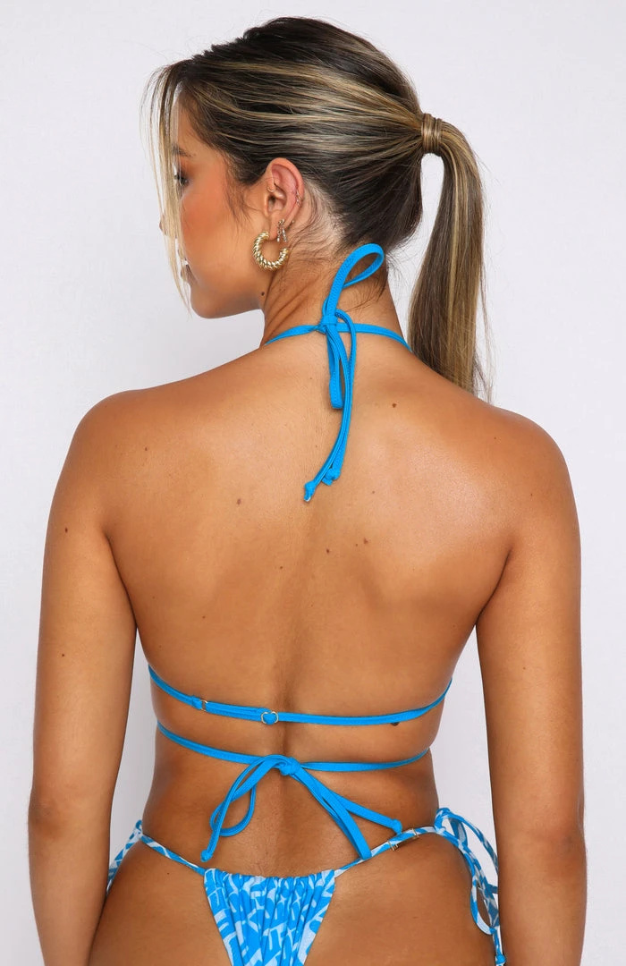 Say hello to summer in our Golden Glow Bikini Top in Blue Monogram Print. This triangle bikini top is a halter neck style with thin elasticated straps, adjustable back strap with adjusters, wrap around front tie detail, blue monogram print and removable padding. Complete the matching set with one of our blue monogram bikini bottoms for the ultimate poolside look.