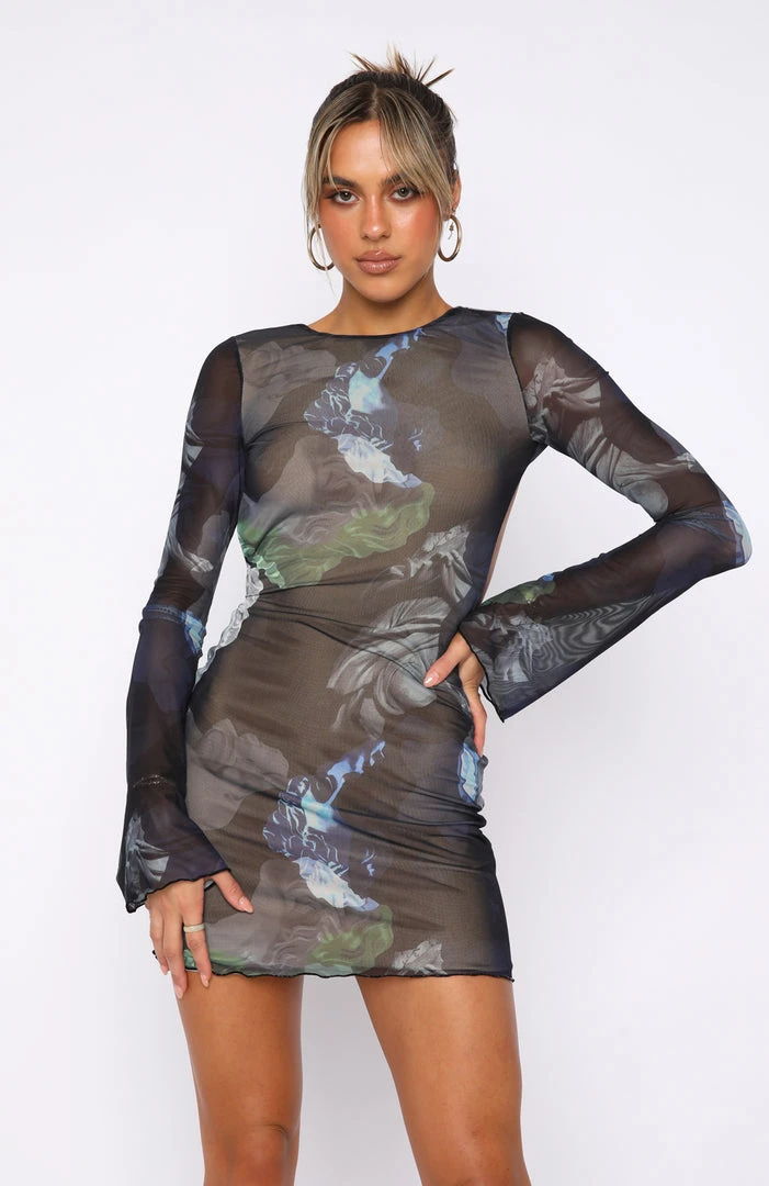 Add some prints to your look in the Indulge Me Mesh Mini Dress in Navy Renaissance. This mini dress is lined, long flare sleeves which are unlined, open back with tie and mini length. We love this teamed with heels and gold accessories for a look we love.