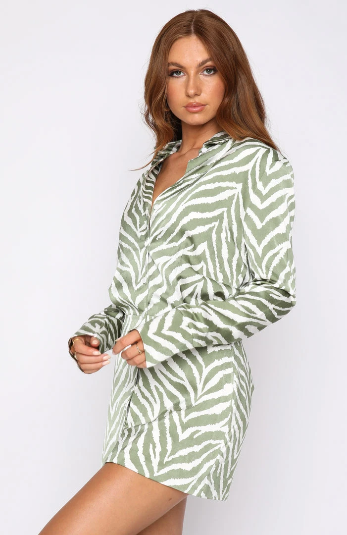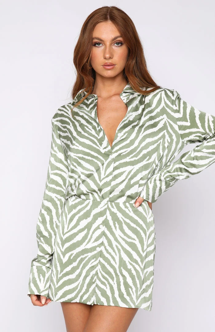 Be the life of the party in the Inspire You Mini Dress in Sage Zebra. Featuring collared neckline, button closure, long sleeves, mini length and lined, silk-feel fabric. Style with clear mules and gold hoops for a stunning look!