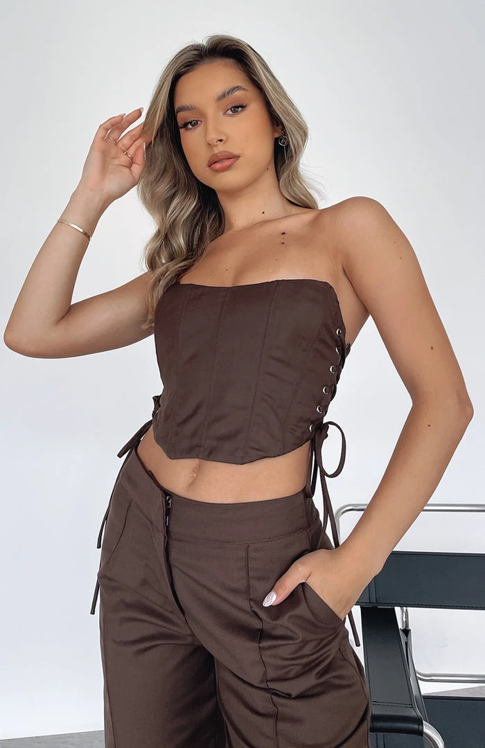 Add some structure to your look with the Main Prize Bustier in Chocolate. Featuring cropped length, boning in bodice, high peaks at bust, curved edge, exposed silver zipper at back, grip tape and lace-up side design. Complete the look with leather pants and heels for the perfect night out look!