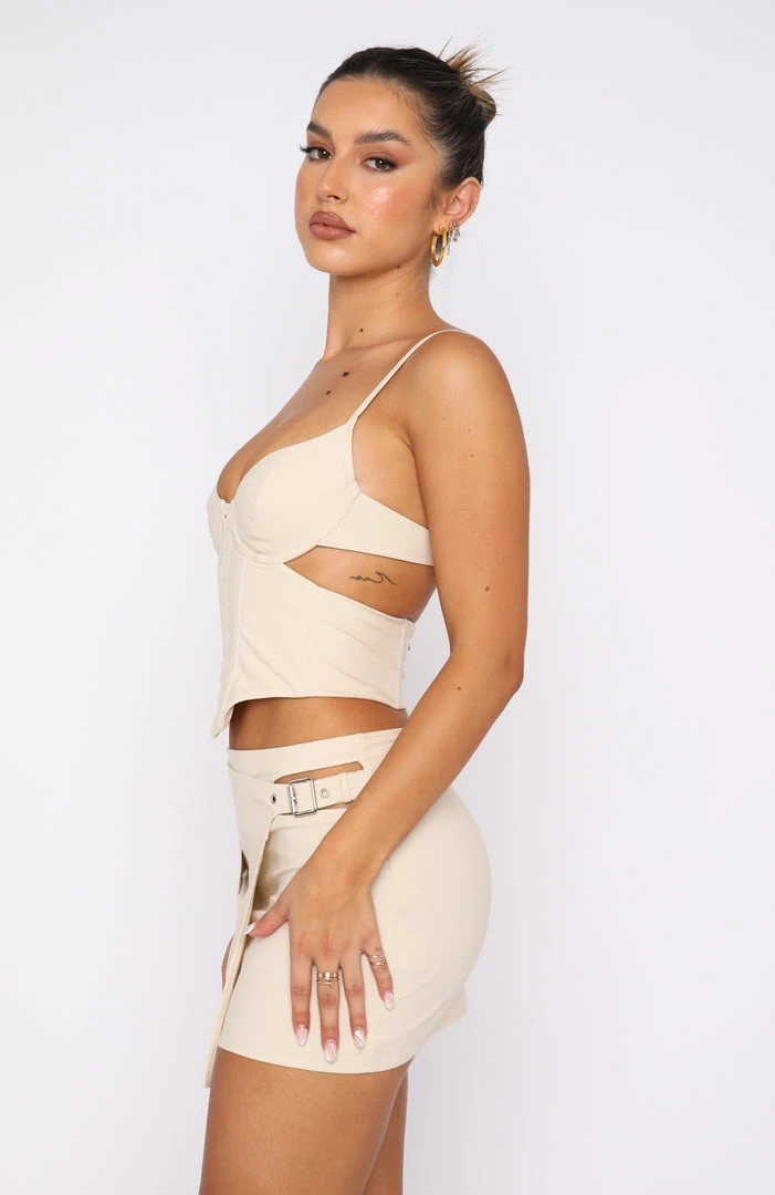 All eyes will be on you in the Matter Of Time Bustier in Beige. Featuring thin adjustable straps, bust underwire, boning in bodice, centre back zipper, front eyelet detail and lined to avoid sheerness. Style with the matching Chosen One Mini Skirt, gold accessories and clear heels. We are obsessed!