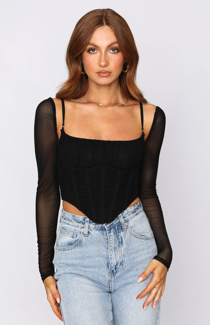 You’ll be influencing them all in our new More Than Basic Long Sleeve Bustier in Black. Featuring long sleeves, thin adjustable straps, bust underwire, boning in bodice, curved edge and centre back zipper. Pair with leather pants and a stylish shoulder bag for an on-trend outfit!