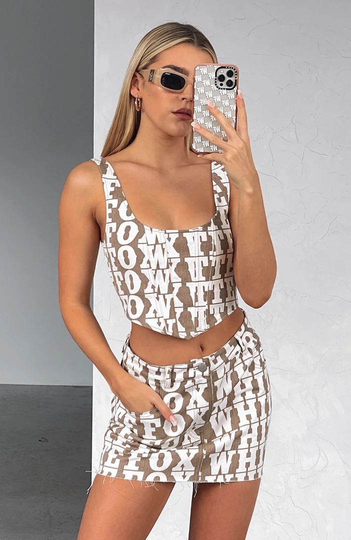 You’ll be looking like sunshine in the Softest Touch Bustier Crop in Mocha Logo Print. Featuring low neckline, boning in bodice, centre back zipper and unlined fabric. Style with the matching Power Hour Mini Skirt and clear heels for a show-stopping festival look!