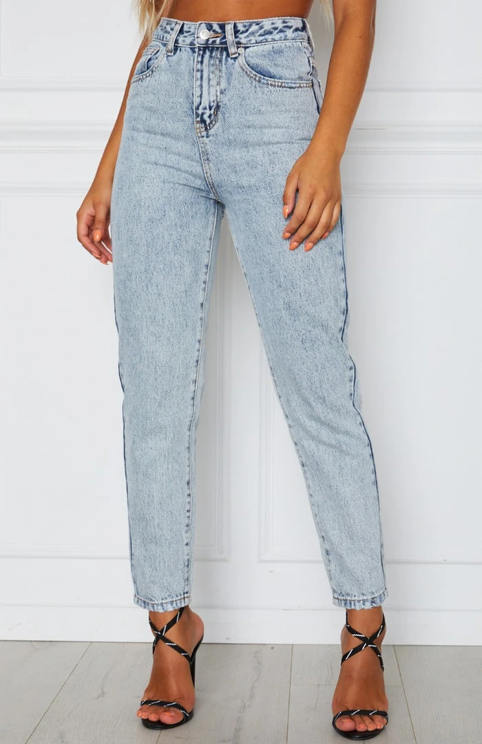The What Goes Around Boyfriend Jeans in Washed Blue Denim are a must have for any wardrobe. These relaxed boyfriend jeans are high waisted with slight distressed hem detailing, 5 pocket design, belt loops, silver button closure, frayed back rip, reflective text embroidery on back pocket & zip at front, and are full length and can be rolled to desired length. Complete the look with crops or t-shirts for a casual but cute everyday look.